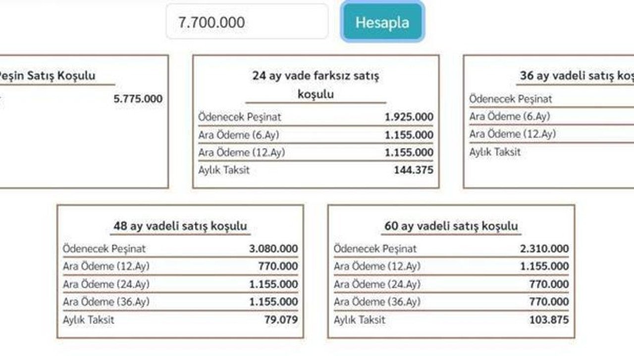 3+1 brüt 102 metrekare olan konut ise 3 milyon 672 bin liradan satışa çıkacak ve yine 10 yıl vade imkanı sağlanacaktı. Proje ilk açıklandığında aylık taksitler 7500 liradan başlıyordu.